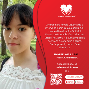 Dacă vrei să ajuți, trimite un SMS de 2€ cu textul ANDREEA la numărul 8832 sau donează cât dorești.